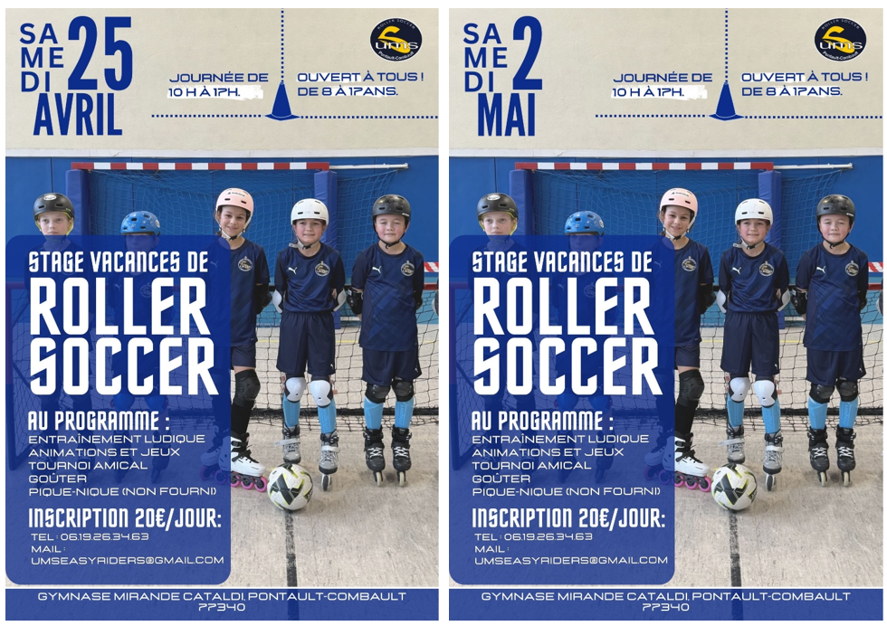 Pendant les vacances de printemps, l’UMS Easy Riders organise des stages de Roller Soccer ouverts à tous les jeunes de 8 à 17 ans (adhérents ou non) ayant un bon niveau de patinage.